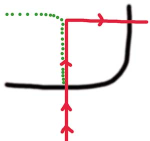 Vi backade en bit från vägen men han hittade inget spår där heller så då fick han som han ville. På andra sidan fortsatte han spåra fint och vinklade sedan höger, och över vägen igen?! (Det svarta på bilden är vägen, det röda är vi och de gröna prickarna är där vi borde ha gått, på ett ungefär, men det visste jag ju inte då.)