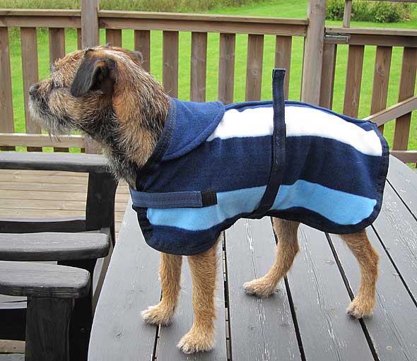 Pyjamasen är tänkt till de gånger när han måste ligga i bilen och det inte är jättejättekallt. När det är det har han ju den hemsydda pyjamasen av dubbel, tjock fleece. Detta är enkel fleece för lite … eh … mediumkallt väder. Inte världens bästa passform, och kardborrebandet på sidan tyder väl på att det är gjort för hundar med lite mer bröstomfång, men so what… För 89 pengar kan man inte få allt. 🙂