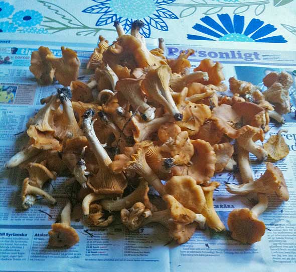 Bland det bästa som finns är de där kompisarna som vet var kantarellerna bor men redan har plockat så mycket att de varken orkar rensa eller äta mer. Har man då tur kan man få sig en guidad tur i kantarellskogen där man själv får plocka det som dyker upp. Igår eftermiddag ägnade vi oss åt det. 🙂 Skörden blev väl inte direkt gigantisk (någon annan hade hunnit före 👿 ) men ca 3 liter med välväxta svamar blev det nog, och det är ungefär nio gånger så mycket som jag hittat i skogarna här hemma på … 20 år. Man tackar och bockar! 🙂