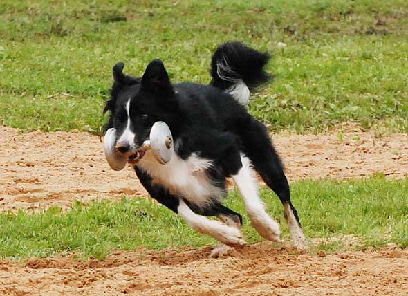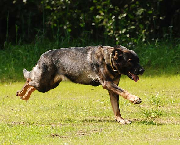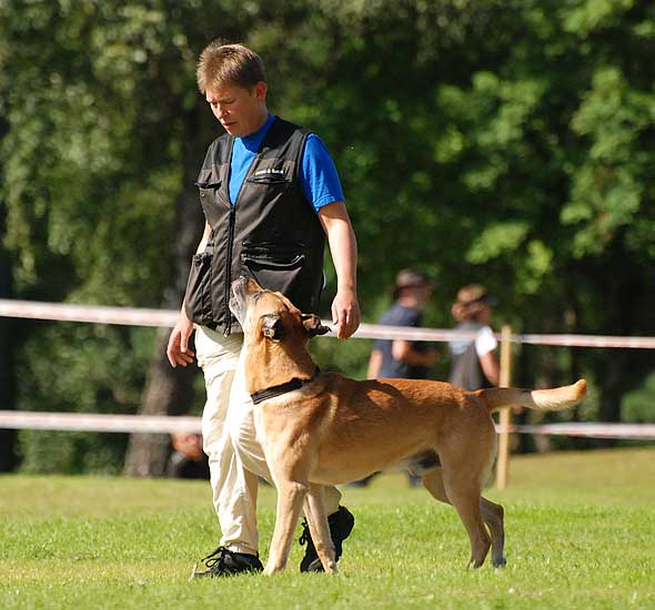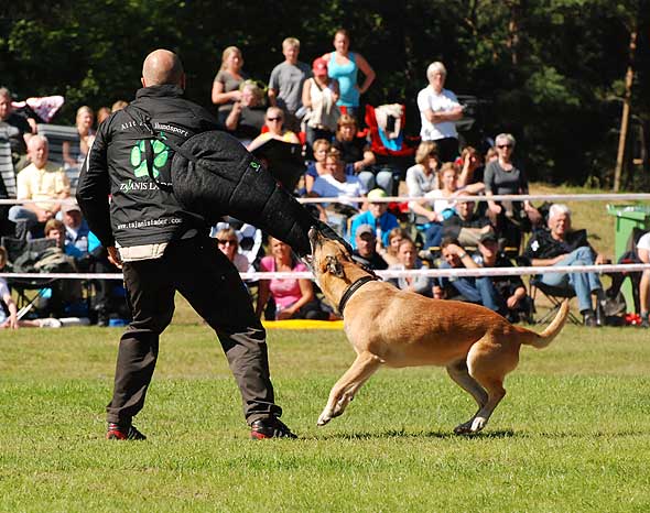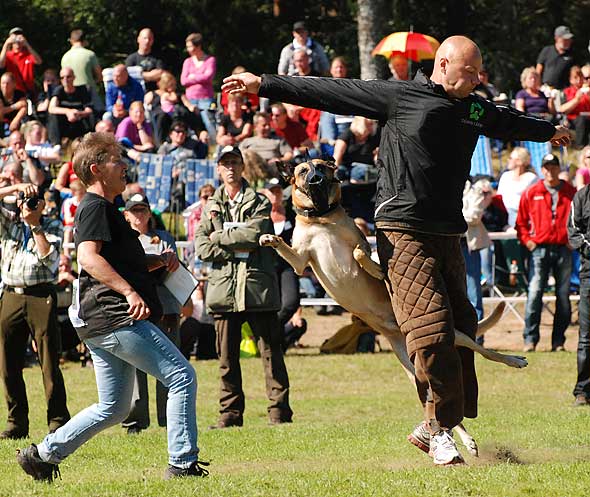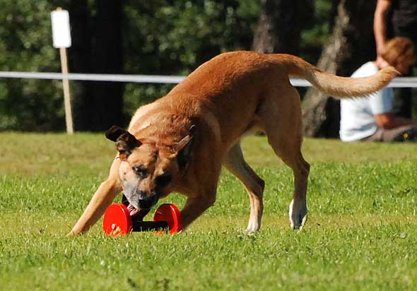 Jag bodde ju ihop med det härliga gänget från Kinds BK. På fredagen var det kamratfest med grillbuffé och sen avslutade vi på puben/discot. På lördagen hade regnandet upphört. Den dagen är det ju mest skogsarbete, dvs inte så publikvänligt, men skydds- och IPO-lydnaden fanns att se. Så förutom det var det mest mingel, och så kunde man ju shoppa. Och det gjorde man. Naturligtvis. På tok för mycket. Alla saker (mestadels kampleksaker och bollar i diverse modeller) är inte testade ännu, men helgens bästa investering var nog utan tvekan den här. En Starmark Funball (minsta modellen) från Dogaccess. Och det lustigaste av allt är att den som är mest begeistrad är … Iza?! Hon tuggar, och tuggar, och tuggar. Hon går omkring med den i munnen och ville helst ta med sig den ut på kvällskissen igår! Hon som normalt spottar ut allt (icke ätbart) om jag sträcker fram handen lämnar INTE ifrån sig den frivilligt. Dessutom verkar ryktet (och marknadsföringen) stämma. Den håller! Inte ens när Lennart ”Terminator” Karlsson försökt döda den en bra stund, flera gånger, syns det minst lilla märke i den. Väl värd sitt (rätt höga) pris alltså.