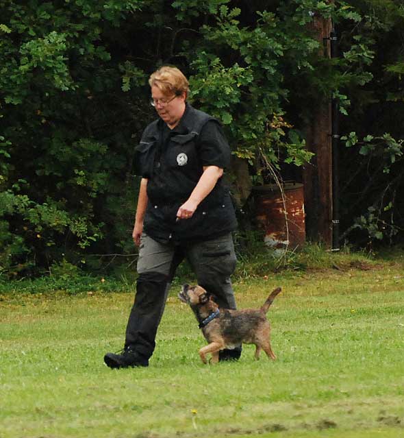 I högre blir man ju anvisad en påsläppspunkt, strax utanför rutan, där man VET att spåret går, och se då hade det lilla djuret inga som helst problem att komma iväg vilket stärker min misstanke om att det varit ”spöken” i själva rutan. Men nåja, vi tuffade på i en för matte väldigt trevlig och lättgådd terräng (jag varken välte eller bröt fötterna av mig) men för lille Lennart var det nog inte lika enkelt. Större delen av spåret gick i ett område där man uppenbarligen kör motocross (eller något annat motordrivet) till vardags. Stundtals på de hårda jordiga ”stigarna” och väldigt ofta över desamma. Massor av olika underlag/terrängskiften var det också. Han jobbade på jättebra, och när jag var nära hörde jag hur det ”smattrade” i näsan på honom. 🙂 Vi hade några tapp, men lyckades varje gång jobba oss tillbaka till spåret, och pinnarna apporterades in i en ganska jämn takt. Till slut stod vi vid spårslutet med alla pinnar i magväskan vilket kändes väldigt skönt. Vid en titt på klockan insåg jag att tiden var ”på gränsen” men att det kanske skulle gå. Mottagaren hade ingen koll på exakt vilken utgångstid som var noterad så det var bara att utgå ifrån att vi klarat det och jobba vidare även om det kändes väldigt snopet med nollan på upptaget. Å andra sidan var jag grymt nöjd med hans jobb i själva spåret och frågan är om det inte är första gången vi haft full pott på pinnarna?