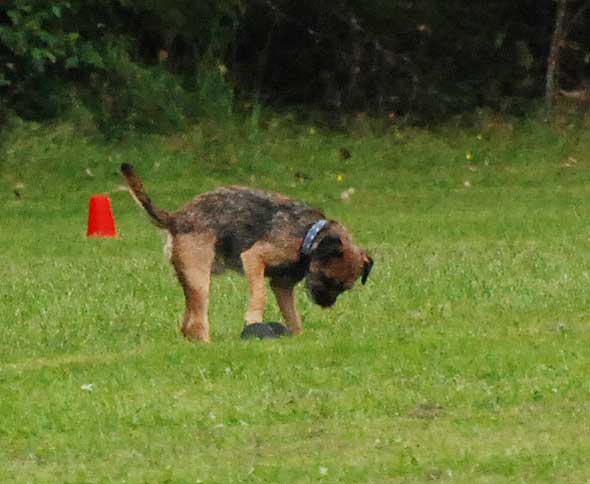 Sen var det dags för uppletande och eftersom jag tyckte han verkade lite sliten/lätt förvirrad på lydnaden var jag skeptisk. Riktigt varmt hade det dessutom hunnit bli. Han fick sig en rejäl avkylning av vattenslangen innan vi gick mot rutan. Jag vet inte om det var det som gjorde det, men vilket härligt uppletande han gjorde! Fyra föremål på (förmodligen) en bra bit under fyra minuter. Betyg 9,5! Han kan om han vill, och det är ju … bra. 🙂