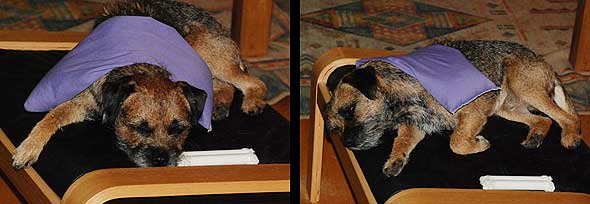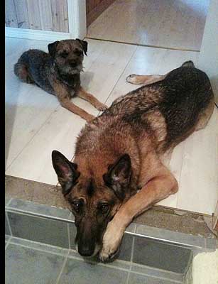 Idag skärpte jag till mig igen och tog ett lydnadspass här hemma. Han gick riktigt bra, men det brukar han ju göra på träning. Det är ju i tävlingssituationen det brakar ihop. Dagens höjdpunkt var väl när jag körde några fjärrdirigeringar, på 20-25 meters håll! Han brukar ju tjura ihop redan när jag står 10 meter bort så riktigt vad som hände i min hjärna när jag gick så långt ska jag inte ens försöka analysera, men det funkade?! OK, alla skiften blev inte rätt – men han gjorde i alla fall något vid varje kommando. Annars har han ju en tendens att bara låsa sig, gärna i liggposition, men inte idag. När Iza och husse kom och ställde sig och tittade på, på fem meters håll, blev han lite okoncentrerad men vi löste det också.