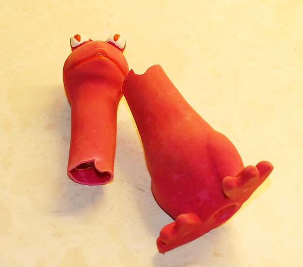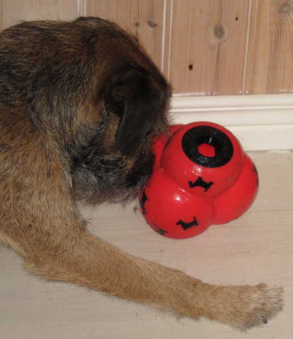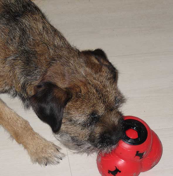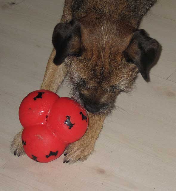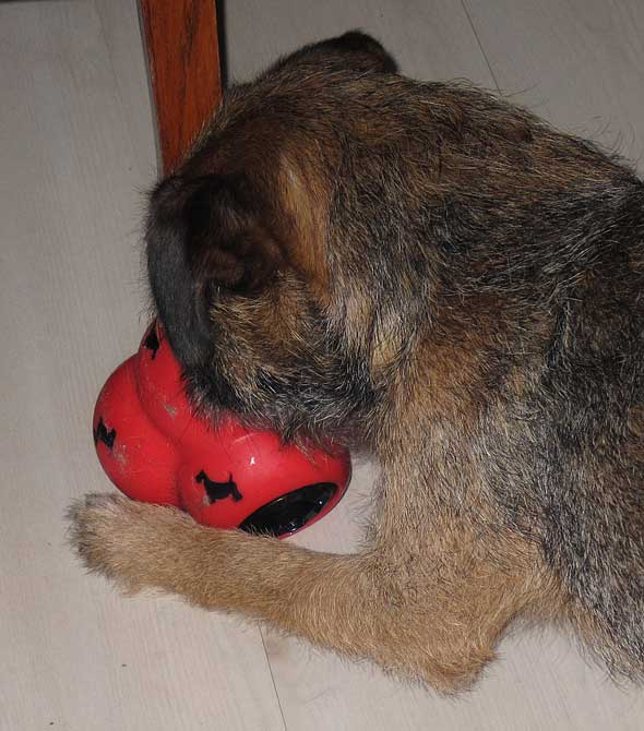 Oj vad han jobbade! Det bästa av allt (för mig) var att den var svår att få grepp på med tänderna så han fick använda diverse andra metoder.
