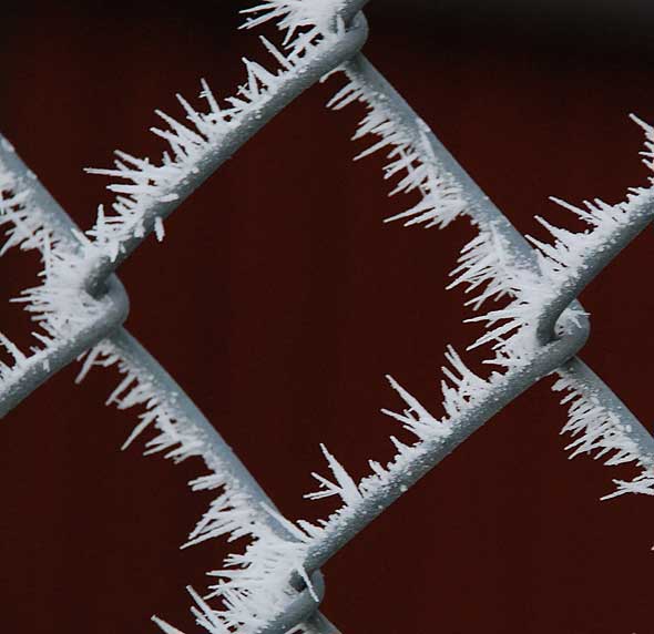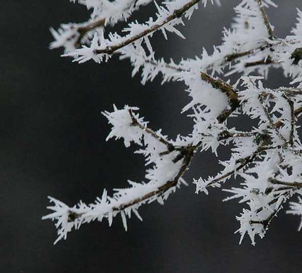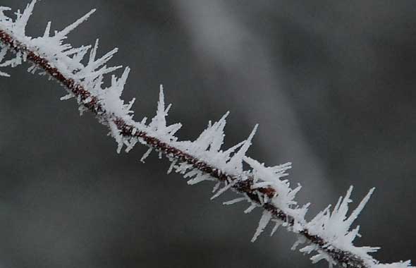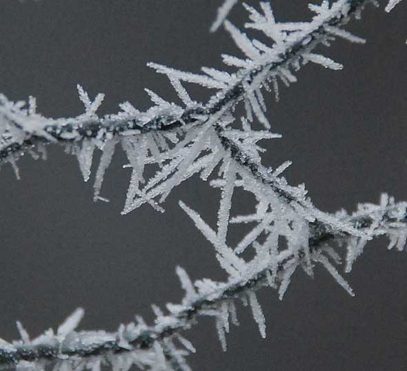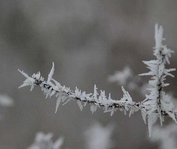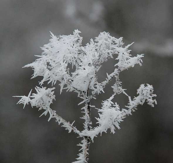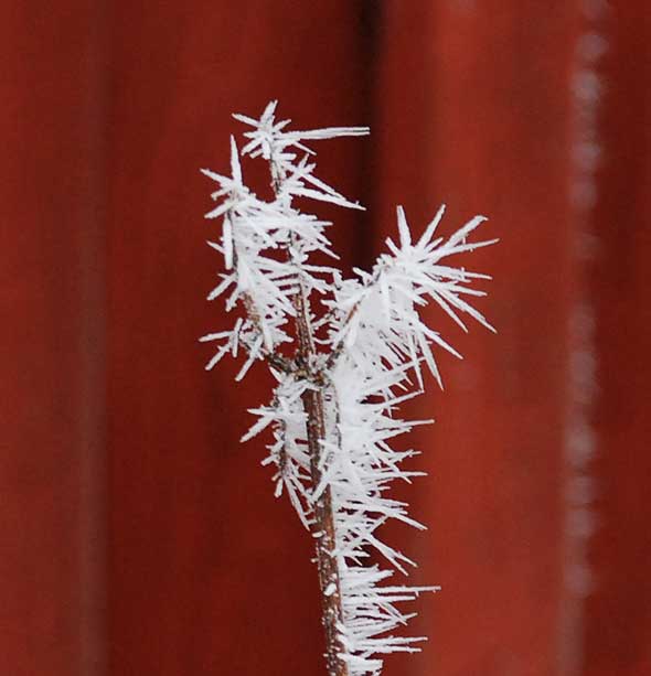 Idag har vi vinterns första någorlunda riktiga rimfrost och ett varv runt huset fick det bli med kameran. Det är ungefär vad jag orkar. Det är väl tur att det är rött i bakgrunden på ett par bilder annars skulle man nog tro att det är fotat, alt. konverterat, till svart/vitt.  Mörk snöhimmel har vi och just i detta nu börjar även snön falla.  😦