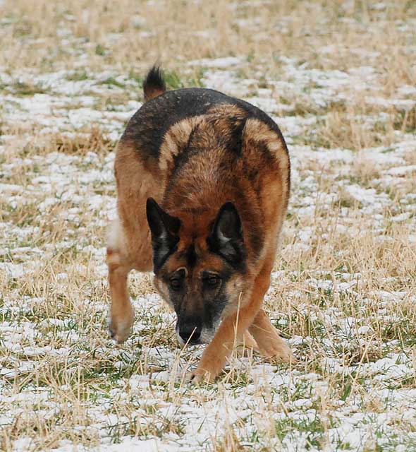 Något som (kanske?) också blir bra när det blir klart är söket. Idag var det dags igen, i stundtals ymning snöfall. Första passet körde vi några hittaövningar i minimal vind. Det gick väl åtminstone halvhyfsat… Som avslutning, när de andra kört sina hundar, körde vi några markeringsövningar. De fyra första gick bra, förutom att han på den första susade förbi figgen och ut på djupet i rutan, men det löste sig till sist. Men efter fyra blev tydligen hjärncellen trött. För att sno ett uttryck från Mullehästen; jetetrött! Fast Mullehästen är oftast jetepigg. 🙂 Vid den femte tappade han (Karlsson alltså, inte Mullehästen) tråden och ställde sig och stirrade mot den punkt där han lämnat mig, men jag var ju inte kvar eftersom jag (heureka!) rört mig framåt på stigen. Allldeles av egen kraft, utan att någon sparkade på mig! Till sist samlade han ihop sig, fick tag på lösrullen och kom in. Lite samma lika blev det på den sista figuranten… Men han hade fina påvis i alla fall. Där rådde det ingen som helst tvekan om vad vi höll på med. En möjlighet, om än inte särskilt sannolik, är ju att han läst regelboken och efter fyra figgar kom på att va’ f*n…  – på tävling är det ju aldrig mer än tre! Vad håller vi på med? Och varför? Nåja, vad som egentligen rör sig i den lilla terrierhjärnan lär vi aldrig få veta. Min tanke, om att byta ut de skitroliga pipisarna mot några inte fullt lika skitroliga pipisar, glömde jag ju bort ungefär lika fort som jag skrev ner den i bloggen efter förra helgen. Men det är fortfarande en plan. Problemet är att det blir minst två veckor till nästa gång och hur stor är sannolikheten att jag kommer ihåg det då?
