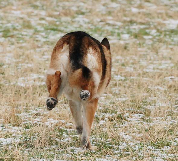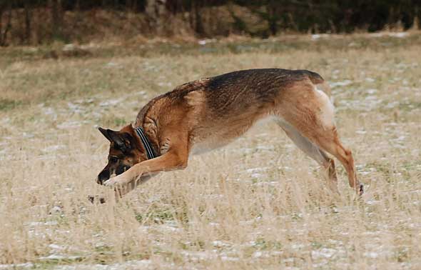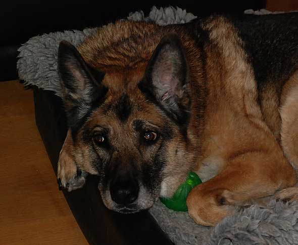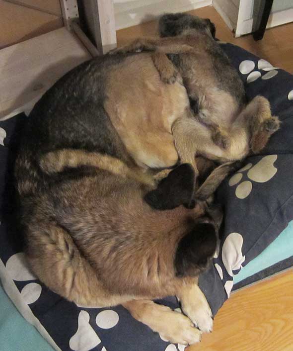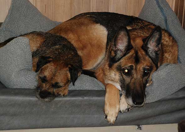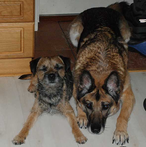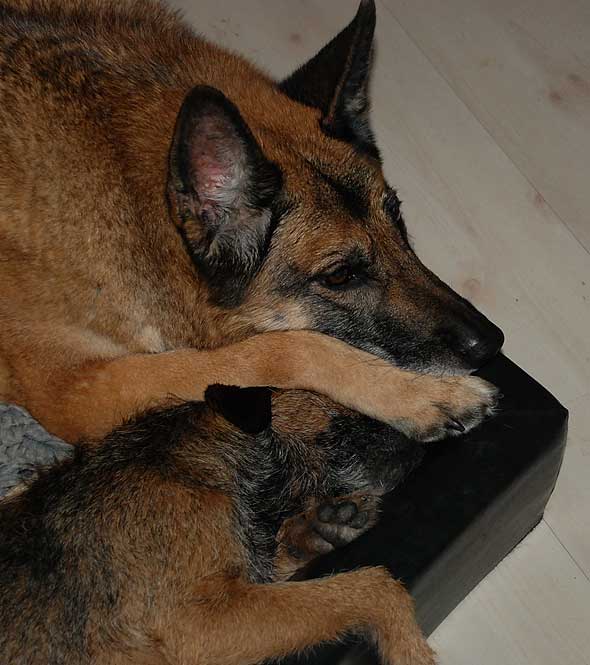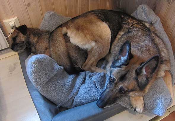 Som jag väl nämnt tidigare så uppstår ett visst kaos här i huset när det vankas promenad. Iza studsar omkring som en rodeohäst på de hala golven om jag inte med hjälp av mutor och fotkommando lotsar henne från pannrummet (”omklädningsrummet”) till ytterdörren. Karlsson leker också rodeo men både hans ålder och kroppskonstitution känns mer lämpade för det än vad Izas gör. Väl där krävs det några kraftiga liggkommandon men vid minst häftiga rörelse från min sida studsar hon upp via en piruett så att hon är startklar, vänd mot ytterdörren. Och så börjar vi om. Under förutsättning att jag inte rör mig som en sengångare förstås. Att det kan vara så oerhört laddat och glädjeframkallande med en vanlig promenad, efter 12 år?! 🙂 Nåja, idag resulterade det första liggkommandot i att terriern hamnade mellan schäferns framben, väl intryck mot hennes bringa. Jag slet tag i kameran men då var tanten snabb att flytta på sig och sen såg det ut så här. Innan jag fått på mig skorna hann hon göra säkert fem uppsittningspiruetter medan Karlsson låg kvar där han låg. Duktig hund den där lilla, ibland. 🙂