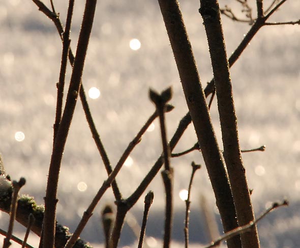 I lördags var det ju tämligen skitkallt (-18° på morgonen) men strålande sol fram på dagen. Någon längre tur med kameran inbjöd inte temperaturen (eller vardagsrumsrivningen) till men en liten fotosejour från altanen blev det trots allt. Och kan man inte skåda ett par (eller fyra) syrenknoppar på rotskotten? Extremt frusna knoppar, men dock … de inger visst hopp – eller hur?