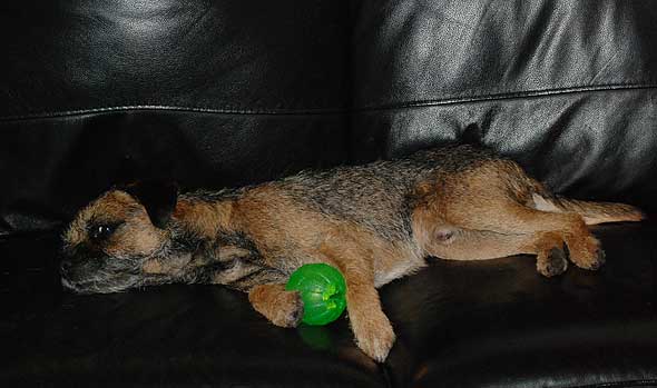 Här om dagen hade Karlsson det så här mysigt i hallen. De gröna bollarna har tydligen många användningsområden. Mest ägnar sig hundarna faktiskt åt att ligga med dem. Ja inte på det sättet alltså, utan ligga tillsammans med dem. Den som har flest gröna bollar när h*n somnar vinner, typ… 🙂