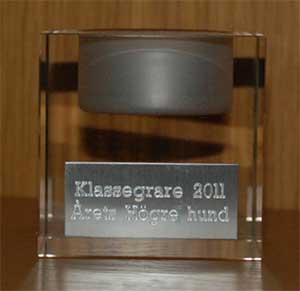 På lördag kväll bevistade jag mitt, troligen, sista årsmöte på Borås BK. Jag har ju inte varit på klubben sedan i september så det kändes lite konstigt. Jag lämnade nyckeln till stugan och hämtade utmärkelsen för årets högreklass-hund. Tittar man på ”bucklan” (som är en ljuslykta) kan man dock börja undra vad som menas. Är Karlsson högre än vad – en tax? 😉 Men man kan å andra sidan försöka bortse från särskrivningen och istället fundera på hur pinsamt det är att bli årets högreklass-hund för tredje året i rad? Troligen kommer man fram till att det är ganska pinsamt eftersom man rimligen borde varit uppflyttad till elit för länge sen… Nåja, jag tror inte den sortens utmärkelse finns i Kinds BK…