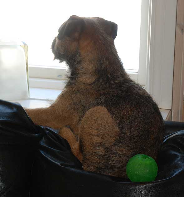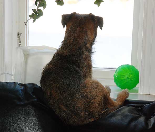 Renoveringen har ju medfört att huset är fullt av fel saker – på fel plats. Bl a så står tresitssoffan numera i hallen! När vi tråcklat den så långt insåg vi att vi inte skulle lyckas tråckla in den i lagården/träningslokalen så där fick den bli kvar. Idag insåg Karlsson att det faktiskt finns ett fönster med utsikt där också. Och inte vilken utsikt som helst. Utsikt mot grannkattens hus! (Observera den gröna bollen… 😉 )