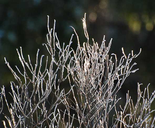 I morse insåg jag att om man sätter 15 tulpaner i en rätt trång vas så får det inte plats så mycket vatten och därför bör man fylla på rätt ofta. När man inte gör det så tackar buketten för sig. Plötsligt och utan återvändo! Den är icke mer och därför blir det lite silveröverdragna snöbärsbuskar istället – precis när solen smög fram bakom skogen i morse.