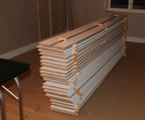 I morgon kommer den riktiga målaren! Hela eftermiddagen har gått åt till att förbereda för detta. Städa tak, städa element, kvistlacka väggen som ska vara ”rå” men målas vit, stålborsta murstock etc. Avslutningsvis har jag staplat alla de målade hyllplanen mitt i rummet för att de ska torka ordentligt. I samband med detta fick jag god användning av alla mina vittringsapporter. Ett gäng spårapporter gick det också åt innan mitt lilla ”torn” var klart.