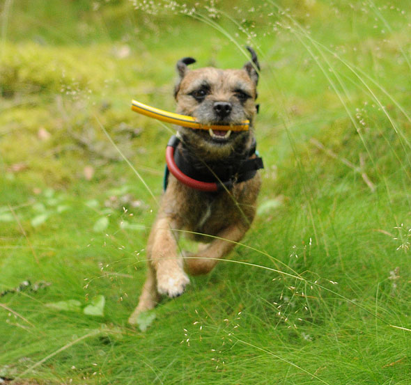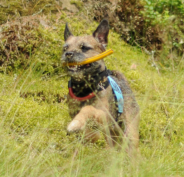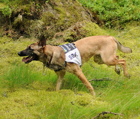 På torsdagen drabbades dock den lilla terriern av soppatorsk de luxe. Då kom A (farbror Bosses vikarierande matte) på att vi kunde använda Fabror Bosse för att skrämma upp honom lite. Det har ju fungerat förr, i både uppletande och spårupptag, så varför inte i söket? Magistern var mycket fascinerad av våra idéer men varför inte prova? Det där med ”skrämma” ska man dock ta med en nypa salt. Bosse skräms inte det minsta, men när han snor terrierns saker (som i det här fallet var sökfiguranterna) så blixtrar det till i hjärnan på det lilla träsktrollet och han får betydligt bättre fokus på uppgiften.