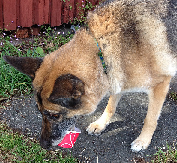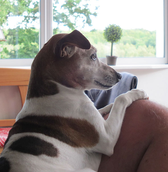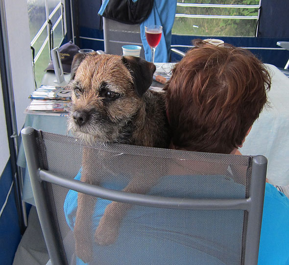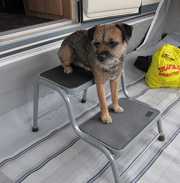 Under dagarna i Karlskrona försökte jag stundtals övertyga terriern om att det fanns alternativa platser (till min axel) för att se ut ur förtältet, t ex trappan till vagnen.