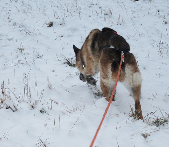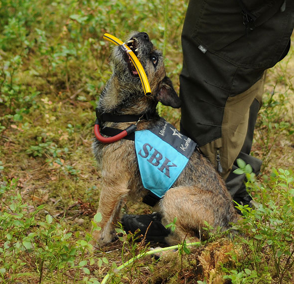 Det mest positiva igår var att han knyckte lösrullarna snabbt som ögat hos figgarna och sprang in till mig med dom. Inget tuggande eller snurrande alls tydligen? Ett stort framsteg! Han gjorde också några oplanerade tomslag (där han hade kunnat hitta figurant) men hade inga problem att gå ut igen när jag skickade om. OK, en gång strulade det men när han fick lite hjälp på traven och dessutom hittade en ”gubbe” när han sprang ungefär där matte pekade så blev det ju jättebra. Nu känns det som om det är dags att gå vidare. Tomskick (planerade), fastrulle, helt kopplade påvis eller något annat? Ingen vet, men jag hoppas på råd och stöd från övriga inblandade. Jag har dock börjat med att försöka organisera transporten tillbaks till stigen. Något direkt ”här”-kommando har jag aldrig haft. Att ha honom i ett strikt fotgående känns aningen överdrivet och är inte nödvändigt, ens enligt regelboken.