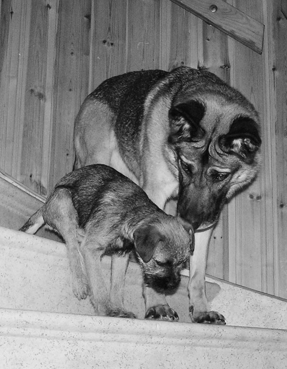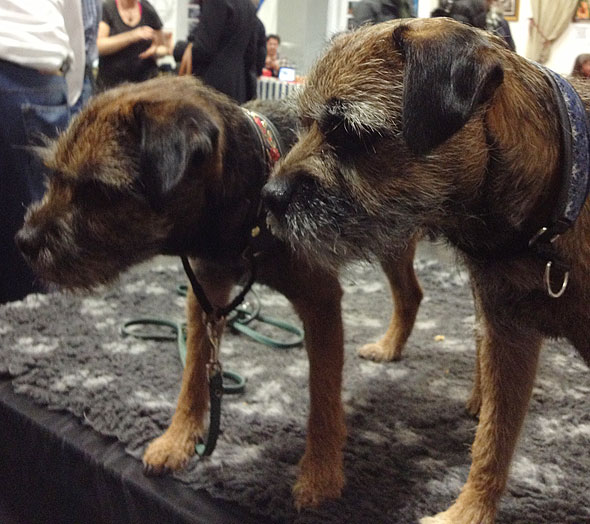 Eftermiddagen tillbringades som sagt i montern, med A-C och tiken Ronja. Matte deklarerade att Ronja kunde vara rätt bitchig mot andra hundar men eftersom Karlsson läste av det innan matte ens öppnat munnen och informerat mig så blev det aldrig något problem. Han vet hur man charmar tjejer den grabben, eller åtminstone är han fullt på det klara med hur man får dem att INTE visa sin bitchiga sida. Man bryr sig helt enkelt inte om dem! En del kanske skulle kalla det att spela svårfångad? Hur som helst så gick det hur bra som helst och efter en stund stod de jämte varandra och delade (nästan) på Ronjas mattes macka. 🙂