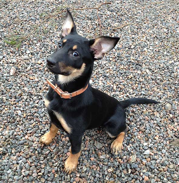 Kompisens Working Kelpie-valp på 3,5 månad. En riktigt mysig liten hund utan ett spår av reservation. Enligt matte dessutom väldigt stabil och orädd, åtminstone så långt i sin levnad. Och där väcktes drömmen om en WK till liv igen. Den något ”lömska” blicken på bilden berodde uteslutande på att jag kommenderat ”sitt” för att Fånen skulle hinna fånga honom på bild och att sitta still när man bara vill pussa på fotografen är en stor prövning. 🙂