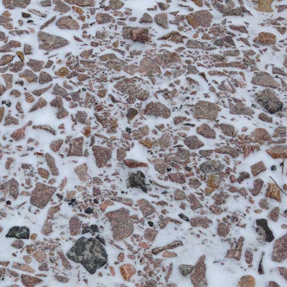 Jag upptäckte även att småsnöandet som nu pågått ett par dagar, i kombination med en rätt grinig nordanvind, har skapat en avancerad mosaik på den nygjorda/omgjorda/renoverade vägen. Men … helt ärligt hade jag klarat mig väldigt bra utan den mosaiken.