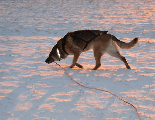 Spåret fick bli på åkrarna i närheten av huset. Nästan 800 meter blev det. Och visst… det var fenomenal spårsnö, men jag är ganska säker på att hon använde näsan och inte ögonen och skulle hon ha använt ögonen litegrann så … spela roll? Hon hade roligt, jag hade roligt och sex av sju apporter hade vi också med oss hem. Nu sussar hon sött. 🙂
