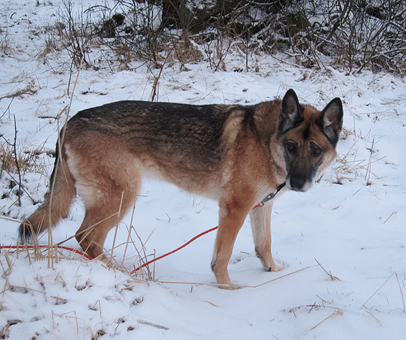 Jodå, trots att minusgraderna och snön tyvärr har återvänt (även om snötäcket än så länge är måttligt) så hittade jag ett vårtecken på lunchpromenaden. Schäferrumpa där det börjar sticka ut ”lösa” hårtussar är minsann ett vårtecken så gott som något. Det börjar alltid på nedre delen av låren, sen vid svansroten och sprider sig neråt svansen, och sen framåt. Joråsåatte…