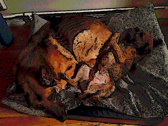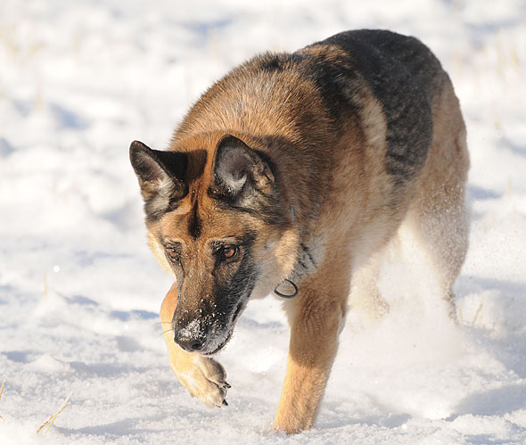 Det är ett tag sedan jag behövde klippa klorna på baktassarna. De sliter hon så bra på egen tass genom att inte lyfta ordentligt på bakbenen. Hon har även tappat en del muskulatur i ländryggen. Det som märks är en viss vinglighet när hon reser sig och när hon ska svänga snabbt och tight inomhus på hala golv. Det verkar dock inte vara något hon lider av. Jag misstänker att det är en begynnande ”schäfervinglighet”. Vad det beror på är nog ingen som riktigt lyckats reda ut men experterna verkar vara ganska överens om att de inte har ont i alla fall. Min tolkning är att nervimpulserna inte riktigt når fram till bakbenen i alla lägen och att de därför inte gör riktigt det som främre delen av hunden förväntar sig. Den här åkomman kan ju drabba betydligt yngre hundar så om det inte kommer förrän nu får man väl i och för sig vara tacksam.