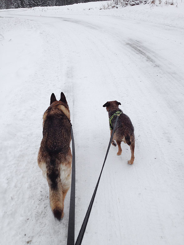 Igår var vi, som sagt, på seniorkontroll. Provsvar har vi inte fått än men hjärta och lungor lät bra och veterinären tyckte också att hon var i väldigt fin form. Lite katarakt (grå starr) har hon men det är inget som märks i vardagen, än. Muskulaturen i bakdelen har naturligtvis blivit sämre, pga schäfervingligheten, men det är inget att göra åt mer än att försöka hålla henne igång och gärna röra sig i terräng där hon tvingas jobba med bakbenen. Matchvikten är densamma nu som den varit i princip hela hennes vuxna liv, dvs 26 kilo. Jag skulle ge bra mycket för den hundens ämnesomsättning. 😉