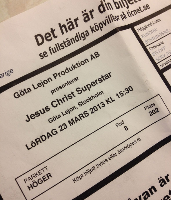 I fredags bar det iväg till huvudstaden för att, för tredje gången beskåda Jesus Christ Superstar. L, som varit med de tidigare gångerna, var med även nu men vi hade dessutom ”lurat” med oss två andra kompisar. De gav dock inte intryck av att känna sig lurade när föreställningen var slut. 🙂