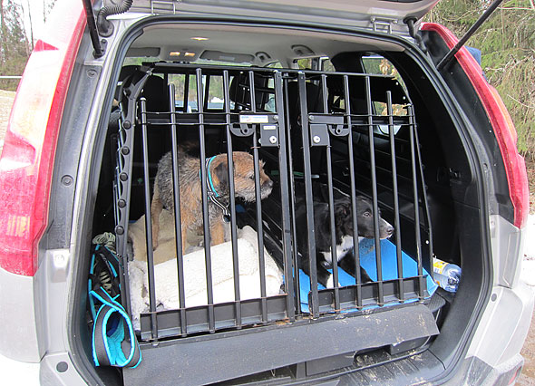 På långfredagen invigde vi buren med att åka några mil söderut för spårträning. Den observante ser att det inte är Iza i den högra buren – det är bordercollievalpen Like. 🙂 Under (den korta) resan till skogen tryckte vi in en fullvuxen bc och en fullvuxen aussie-tik i samma bur så jag tror inte det kommer bli så synd om Iza?