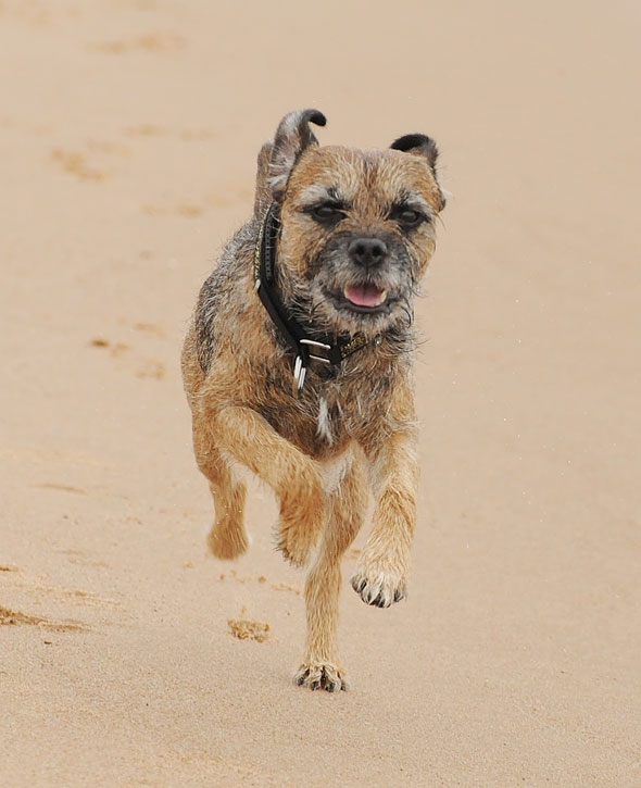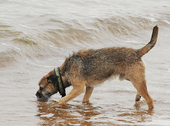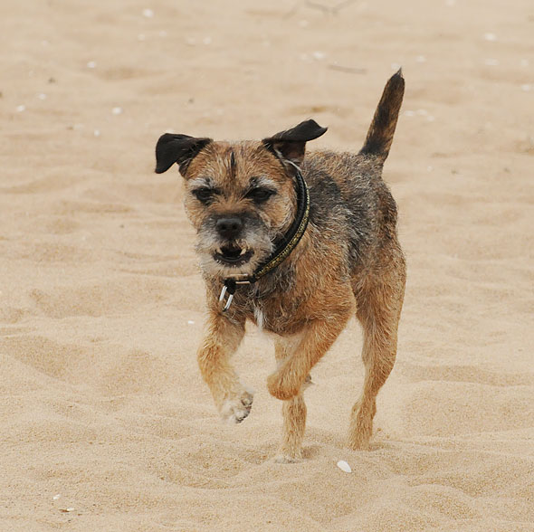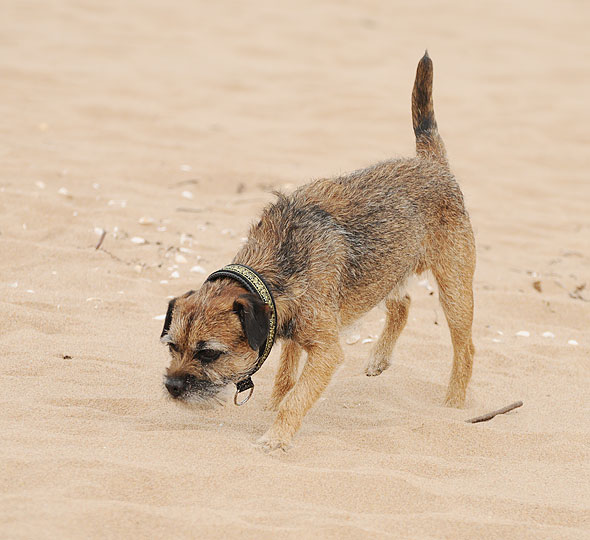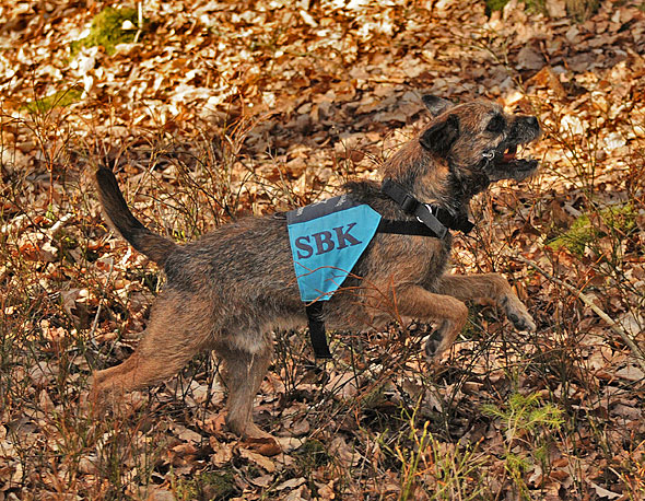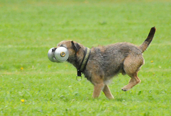 Det krävdes ett extra kommando kombinerat med en (ett?) knävift för att få iväg honom men sen… jösses vilket tempo?! Det var helt klart bordercollietempo fast i borderterrierformat, typ. 🙂 Spikrakt ut till rutan men pga ett lite för sent kommando från mig stannade han inte förrän på bortre markeringen och damp ner på densamma = utanför. Jag lastar inte terriern för det. Han gjorde hela momentet kanonsnyggt och hade rutan varit markerad med något annat än luddigt sågspån som sjunkit ner i gräset hade jag kanske haft en chans att styra upp det? Är det någon som ser markeringen? Jag SKA skriva den där motionen till nästa regelrevidering, jag lovar!