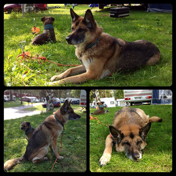Vi drog vidare till Falun och slog läger hos A och Gino. Där fick vi en fin campingtomt, förvisso utan sjöutsikt men rymlig, lugn och nära till servicehuset. 😉 Där åt vi god mat, husse byggde garagegolv i ett par dagar och jag vallade hundar i det fina naturreservatet som ligger utanför husknuten. Hundarna åt blåbär i mängder. Medan A och husse byggde garagegolvet hann jag även med att trimma Gino. 🙂