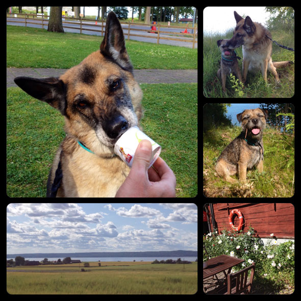 På onsdagen blev det en utflykt till Visingsö där jag aldrig varit tidigare. Det var oerhört vackert och eftersom vi hade bilen med oss hann vi avverka hela ön från norr till söder. Jag försökte ta några fina bilder på hundarna i Ekskogen men det blev inte riktigt som jag tänkt mig. 😉 Glass fick vi iaf, allihop, men Iza tyckte bägarna var lite för små eftersom hon inte kunde få ner hela nosen. 🙂