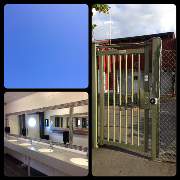 Avslutningsvis blev det två nätter i Gränna, på vägen hem liksom. En camping där man kanske borde ha lagt lite mindre krut på kakel, klinker, speglar och fake-marmor i servicehuset och lite mer krut på fungerande duschar och krokar i duschutrymmet? Man hade dessutom lagt mycket krut på staket som gav en viss koncentrationslägerkänsla. Runt servicehuset kunde man nästan misstänka att det var el i staketet och åt ena hållet runt campingen var det halvhögt stängsel med taggtråd längst upp?! Åt andra hållet var det inget staket alls? Kändes aningen ologiskt. Trots att jag bett att få en plats i ”utkanten där man lätt kan komma av och rasta hundar” så hamnade vi i den mest inhägnade delen där det var långt (och omöjligt) att ta sig iväg utanför campingen med nödiga hundar på morgonen. 😦 Gränna bjöd iaf på blå himmel och det är ju en mysig liten stad.