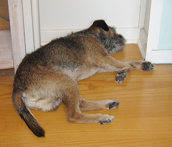 På förmiddagen, när jag satt och jobbade, flög den lilla jakthunden helt plötsligt upp ur sin bädd och fattade posto i den platsbyggda hyllan vid murstocken. Han snusade, lyssnade, gjorde ansatser till att gräva (i laminatgolvet!) och var mycket intresserad. Just där är det väl tätat med lister o dyl så att vaddetnuvar skulle krypa fram just där kändes inte särskilt troligt. Och en husmus i murstocken?! Tja, konstigare saker har väl hänt?
