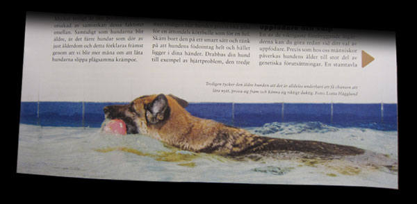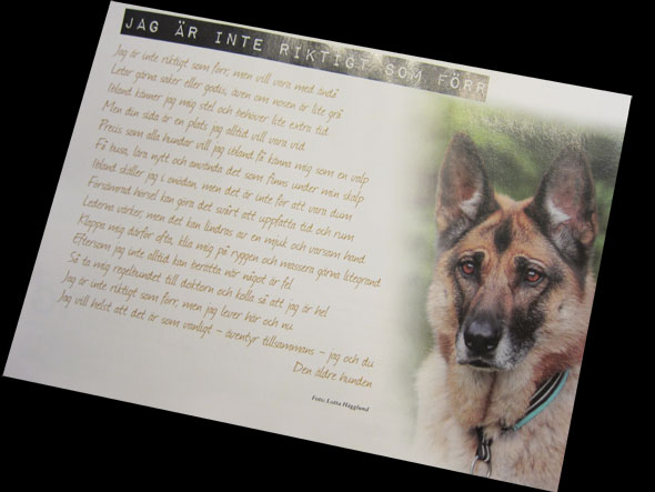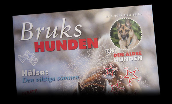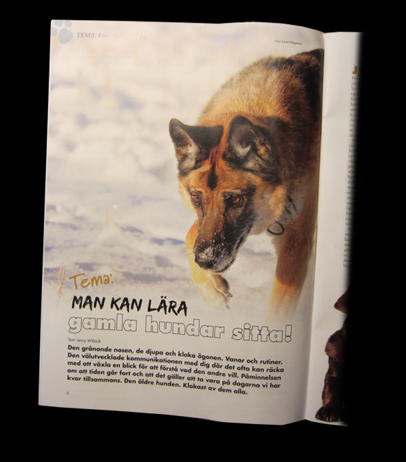 Nåja, om vi ska vara ärliga så fick Iza en något undanskymd placering på omslaget – infälld, uppe i ena hörnet. Inne i tidningen fick hon dock en helsida och ett par mindre framträdanden på temasidorna om ”den äldre hunden” som Jenny Wibäck har skrivit. Kan man inte bli berömd och hamna i Brukshunden under sin livstid så kan man tydligen (som många stora konstnärer) bli berömd när man inte finns längre. Det värmer dock mattehjärtat ändå. 🙂