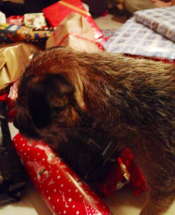 När det var dags för själva julklappsspelet fick han dock vara med, och han gick in för det med liv och lust utan att ta någon som helst hänsyn till regler, tärningar och annat trams. Han slängde sig ogenerat in i högen av paket och började öppna. 🙂 Något som jag tyckte var lite kul men jag tror inte alla andra var lika imponerade så jag fick försöka styra upp det hela. Men när hela köksgolvet är fullt av paket och människor har jag viss förståelse för att självbehärskningen flög sin kos, om han ens hade någon från början. Paket är ju paket och det var länge sedan vi slutade lägga sådana under granen, av förklarliga skäl. Detta ohämmade paketöppnande ledde ju till att när matte slog sina sexor, det var rätt gott om dem i första fasen, så hade jag ju inte mage att ta något annat än de halvöppnade paketen. Men so what? 🙂