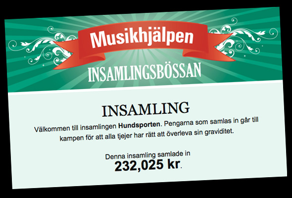 Stora delar av veckan har SVT Play gått i bakgrunden på datorn och titt som tätt, väldigt titt som tätt, har jag kollat in FB-sidan och ställningen bland de ”privata” insamlingsbössorna. Där har Hundsporten legat i täten hela tiden och igår kväll, via en ”flashmob” skenade det iväg rejält. 😉