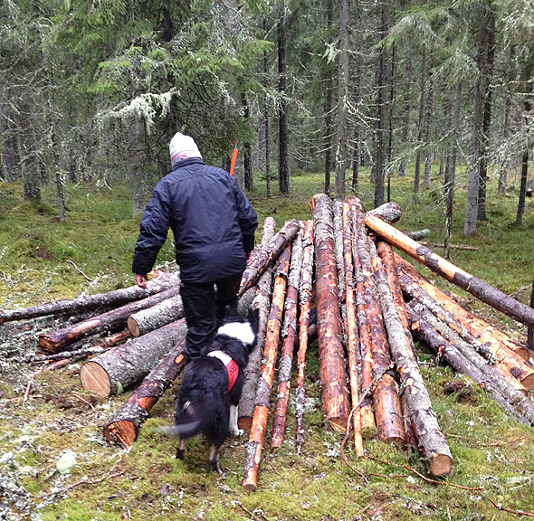 Vi började med en figge i varje hörn, ett par tomslag och sen en figge i en ”vedtrave”. Det gick att ta sig in om man var i flugviktsformat, och det gjorde naturligtvis den lilla flugviktaren. 🙂 Nåja, han hittade i alla fall, och skällde en stund innan han kröp in mellan stockarna. Bilden är från när nästa hund hittat figg på samma ställe.