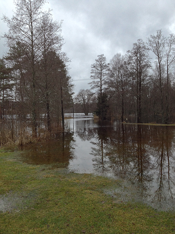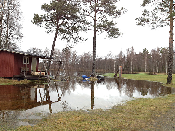 Halva appellplan står under vatten och det är inte så långt kvar till stugan (som tack och lov står på plintar). I den lilla stugan på bilden brukar vi bl a hysa in en instruktör under lägerveckan…
