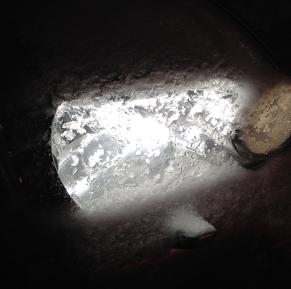 I måndags såg mina billyktor ut så här när jag skulle åka till jobbet. Och det gick inte att få bort! Resten av bilen var naturligtvis täckt i ett liknande islager och torkarbladen hade frusit fast/sönder vilket resulterade i stopp för att skrapa rutor efter några kilometers färd.