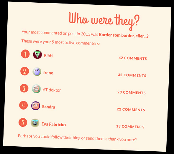 Jag har verkligen börjat förlika mig med att kommentarer numera är sällsynta (men väldigt uppskattade när de kommer). Jag ser ju att besöksantalet rusar iväg när jag skriver något och inläggen automatiskt länkas till FB. Ibland får man en kommentar på Facebook, eller ett klick på gilla-knappen, men eftersom det är vad folk orkar med får man väl nöja sig med det. Jag är också ganska slö med kommenterandet numera. Som jag tidigare konstaterat; läser man från mobil eller padda är det rätt jobbigt att fylla i vem man är, varje gång. Från datorn går det lättare och jag försöker ändå att kommentera då och då hos dem jag känner. Men … bloggandet är för min egen skull. Det är min (censurerade) dagbok, och därför har jag slutat hänga upp mig på uteblivna kommentarer. 😉