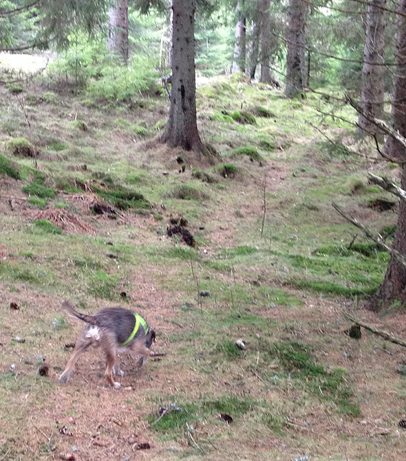 När vi brottade oss fram i detta fick jag en känsla av att vi när som helst skulle snubbla på en lomhörd älg som låg och sov? Att vi dessutom, på grund av en smärre felnavigering, fick gå i den täta granplanteringen ungefär tre gånger så länge som vi egentligen hade behövt har vi försökt förtränga. Här var det jättefin gammal skog under mina första år som hundägare och jag och dåvarande schäfern trampade upp en alldeles egen stig. Jag blev onekligen lite sentimental när jag under förra veckan hittade den stigen igen, efter 15 år?!