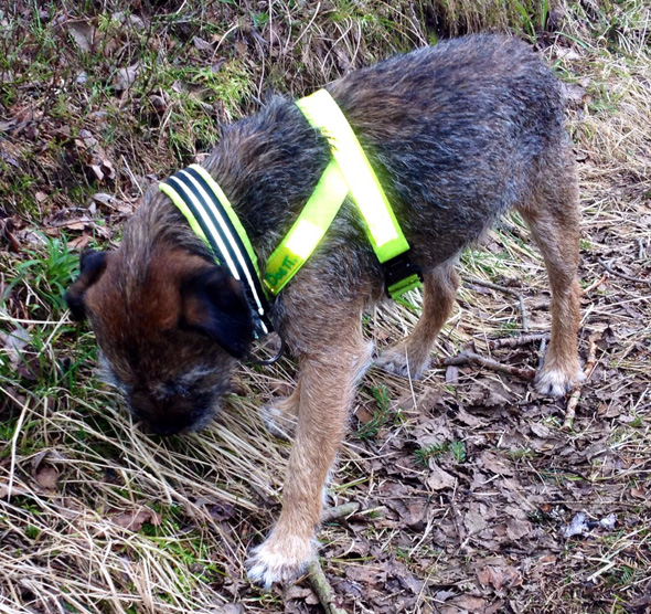 Sedan sist har vi hunnit med två sökpass. Duktig hund förra helgen och ganska duktig hund igår men, precis som de stora pojkarna och flickorna kunde han inte för sitt liv begripa varför han skulle ut på motvindssidan när han ändå var helt på det klara med att det inte fanns någon figurant där. Detta ledde till ett par diskussioner men frågan är om han lät sig övertygas eller om det bara var ett spel för galleriet när han faktiskt travade ut där och vände? Gårdagens ruta har också en betydligt stökigare terräng vilket leder till att skicken inte blir så raka för den lilla kortbeningen… Nåja, när det är tävlingsdags får vi hoppas på medgörlig vind iaf, dvs en trevlig medvind på stigen för då brukar han ta sig ut på djupet. Terrängen lär nog kunna motsvaras av gårdagens ruta eftersom det var en av klubbens tävlingsrutor men enligt säker källa inte den som ska användas på årets tävling. Solen sken på oss för första gången på tre månader och att ligga figurant var ett rent nöje som omväxling efter alla blöta, kalla legor under vintern. 🙂