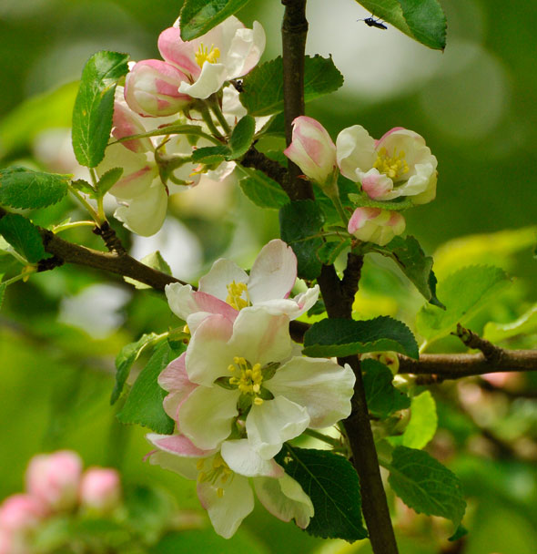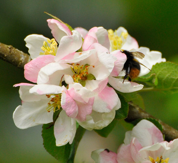 Och det dyker upp en liten flitig trädgårdsarbetare bland äppelblommen också. 🙂 Ett 70-300-objektiv kan åstadkomma en hel del, åtminstone så länge man inte tänkt sig humlor i storbild på väggen utan håller sig till webb-publicering. 😉