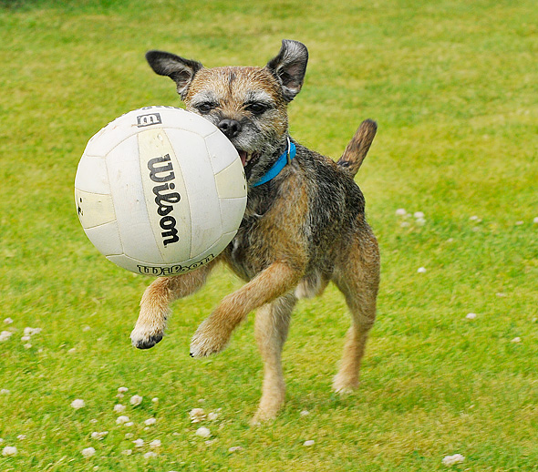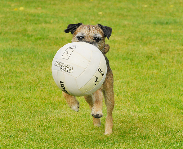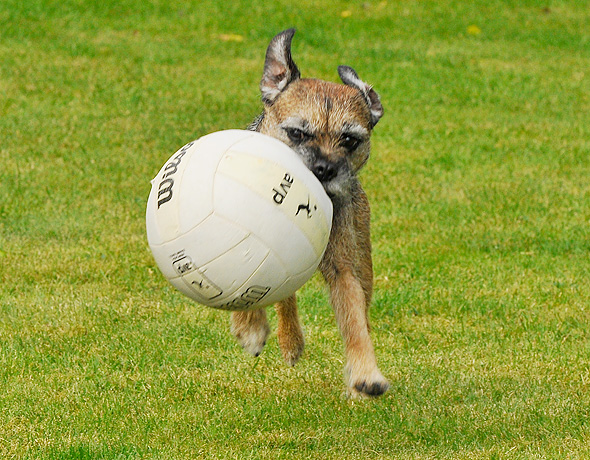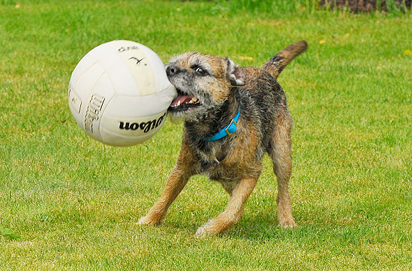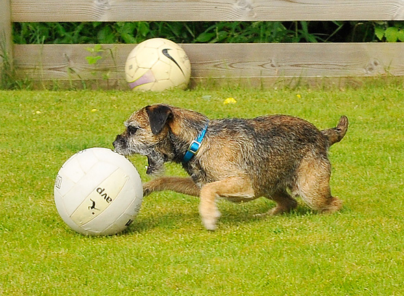 Karlsson provade glatt alla leksaker som fanns tillgängliga + några till. De där andra två bryr sig inte särskilt mycket om sina leksaker men även det de alltid finner ointressant tyckte Karlsson var roligt. Sen hittade han något som väl egentligen inte alls var en hundleksak, men det blev… Jag vet inte vad han sett av fotbolls-VM som inspirerat till detta?