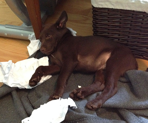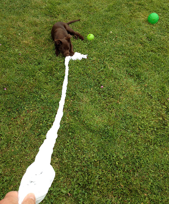 Förutom att bita på diverse slumpmässigt utvalda saker (träningscyklar, möbler, mattor, bia-bäddar, köksinredning, fleecefiltar … jag skulle kunna hålla på hur länge som helst) så har han en märklig hobby; pappersstrimling! Något sådant har väl jag aaaldrig ägnat mig åt! Men för att ta igen det, det kan ju kanske vara roligt, så har jag också provat. Och jodå, det var väl lite kul, men största fördelen var att han bet och slet i papperen istället för i mig.