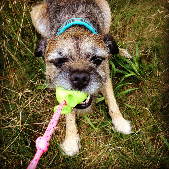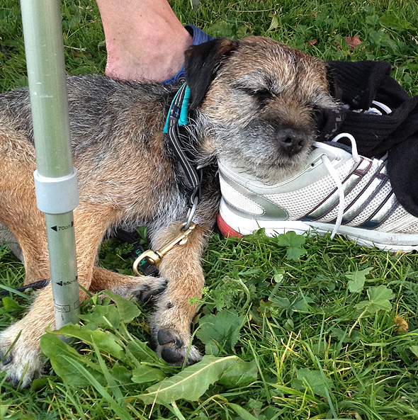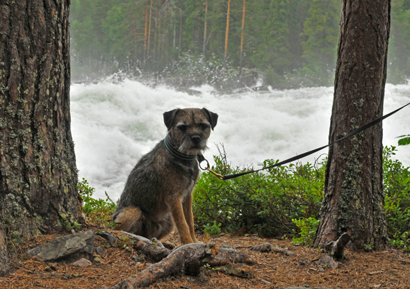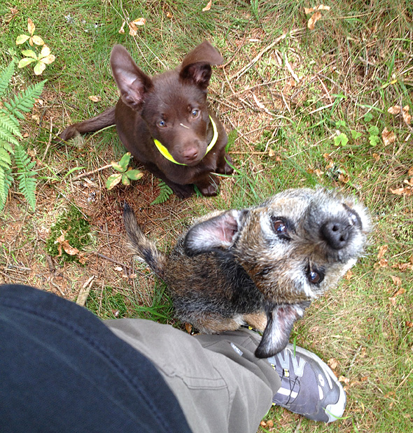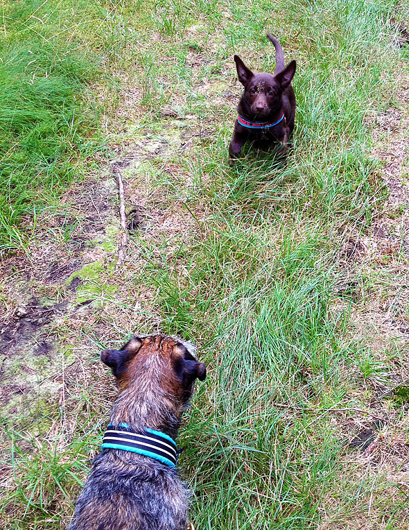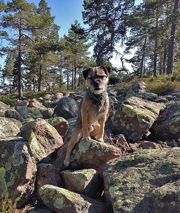 Ibland lägger han sig platt ner och blänger på mig, som om jag vore nå’n sorts jäkla får, och han en bordercollie?! Ibland smyger han på mig också, som om jag inte skulle märka det? HA! Lite sorteringsförmåga borde man väl kunna kräva även av en liten slyngel, eller åtminstone att han ser skillnad på en borderterrier och en fårskalle?