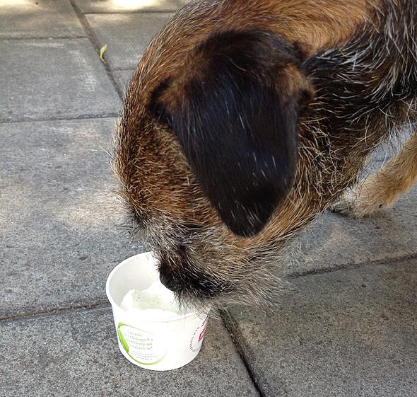 Det där med maten är över huvud taget ett pinsamt kapitel. Han saknar uppenbarligen all form av värdighet och har ett synnerligen obalanserat förhållande till mat. När matte fixar till vår mat så är det show på köksgolvet. Han gör triple salchow, slår kullerbyttor och försöker välta matte. Rätt underhållande i och för sig men jag vet inte riktigt hur han tror att det ska göra att det går fortare? Han har i alla fall lärt sig att min mat är min mat och det är väl egentligen huvudsaken.