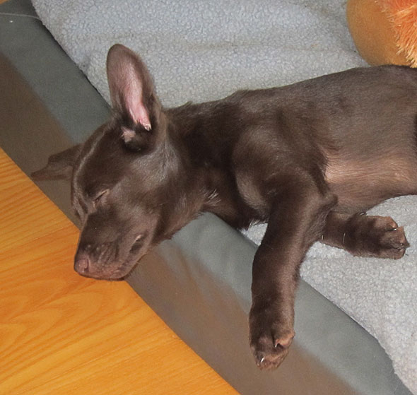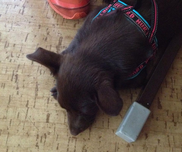 …precis innan han somnar – då är han rätt söt. Raglar omkring som ett fyllo, tuggar lite slött på ett stolshjul här, ett papper där, en Bertil, en korg, en… Välter lite här och där men uppbådar lite nya krafter och raglar omkring en stund till. Men allra sötast är han nog sekunderna innan han verkligen faller i sömn. Så här såg det ut efter morgonpasset idag.