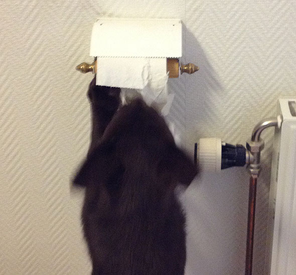 Högst upp på önskelistan verkar han ha en egen toarulle. Han har sneglat längtansfullt, och han kastar sig som en galen vithaj efter det papper man drar ut från hållaren för att själv använda. Nu har han växt till sig såpass att han når rullen på hållaren själv också. Lycka, åtminstone för honom…